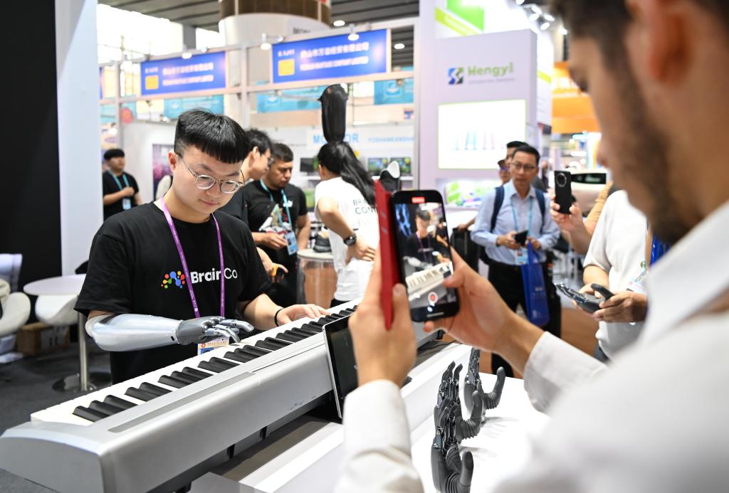 An exhibitor wearing a bionic arm plays an electronic keyboard at the 135th session of the China Import and Export Fair, also known as the Canton Fair, in Guangzhou, south China's Guangdong Province, April 17, 2024. The 135th session of the Canton Fair opened Monday in Guangzhou. The smart life product zone of the fair attracted nearly 200 exhibitors and numerous visitors. (Xinhua/Deng Hua)