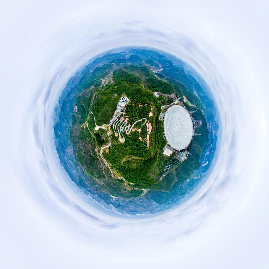 A drone panoramic photo taken on Feb. 27, 2024 shows China's Five-hundred-meter Aperture Spherical Radio Telescope (FAST) under maintenance in southwest China's Guizhou Province. (Xinhua/Ou Dongqu)