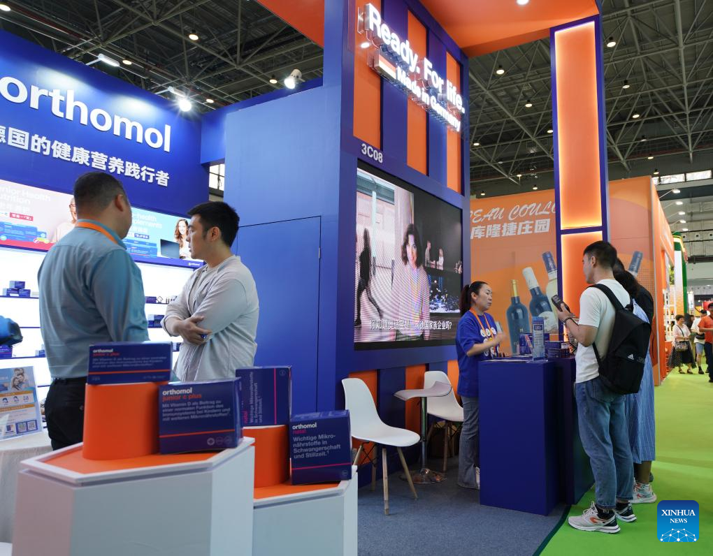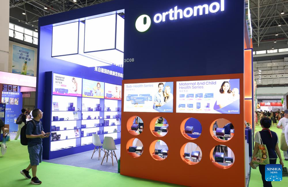 Visitors walk near the booth of Orthomol during the fourth China International Consumer Products Expo in Haikou, capital city of south China's Hainan Province, April 17, 2024. The fourth China International Consumer Products Expo, which lasts from April 13 to 18, is China's only national-level exhibition featuring consumer products and is also the largest consumer expo in the entire Asia-Pacific region. (Xinhua/Yang Guanyu)