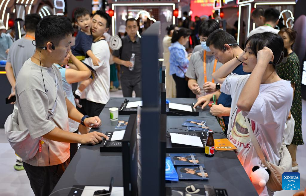 Visitors try the earphones of Shokz during the fourth China International Consumer Products Expo in Haikou, capital city of south China's Hainan Province, April 17, 2024. The fourth China International Consumer Products Expo, which lasts from April 13 to 18, is China's only national-level exhibition featuring consumer products and is also the largest consumer expo in the entire Asia-Pacific region. (Xinhua/Guo Cheng)