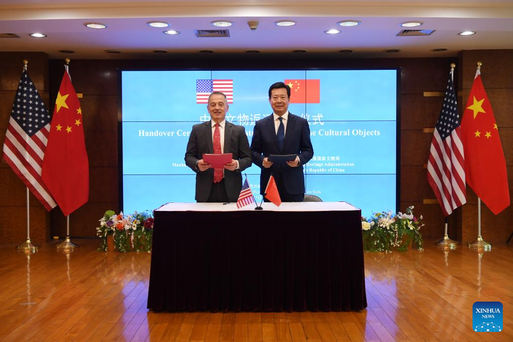 China's Deputy Minister of Culture and Tourism and head of the National Cultural Heritage Administration Li Qun (R) and Matthew Bogdanos, chief of the Antiquities Trafficking Unit of the Manhattan District Attorney's Office, attend a handover ceremony of returned Chinese cultural objects at the Chinese Consulate General in New York, the United States, on April 17, 2024. The U.S. side returned 38 pieces of Chinese cultural objects to the Chinese side on Wednesday. (Xinhua/Li Rui)