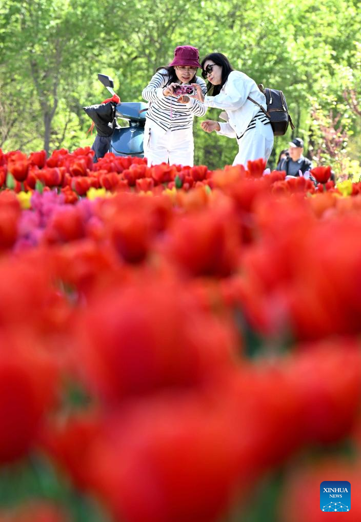 Visitors take pictures of flowers at a botanic garden in Shijiazhuang City, north China's Hebei Province, April 16, 2024. (Photo by Chen Qibao/Xinhua)