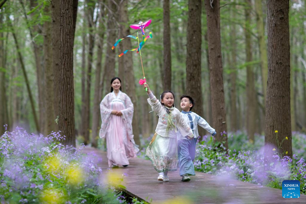 People visit the Lixiahe national wetland park in Xinghua, east China's Jiangsu Province, April 17, 2024. (Photo by Zhou Shegen/Xinhua)