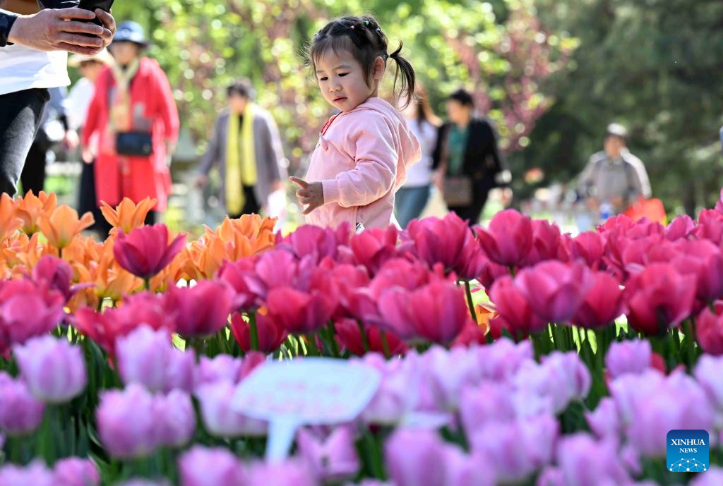 A child is seen among flowers at a botanic garden in Shijiazhuang City, north China's Hebei Province, April 16, 2024. (Photo by Chen Qibao/Xinhua)