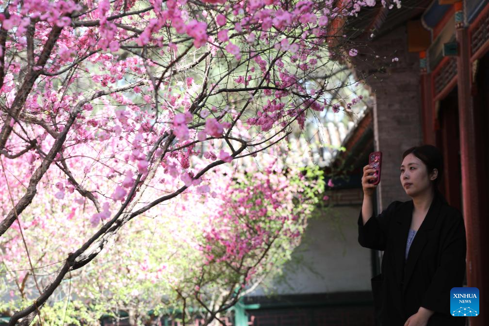 A woman takes pictures of blossoms at the Imperial Summer Resort in Chengde, north China's Hebei Province, April 17, 2024. (Photo by Liu Huanyu/Xinhua)
