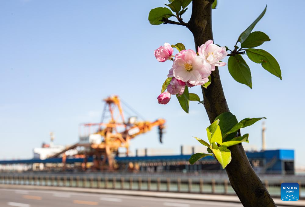 This photo taken on April 16, 2024 shows Chinese crabapple blossom near Huanghua Port in Cangzhou City, north China's Hebei Province. (Photo by Liu Jianling/Xinhua)