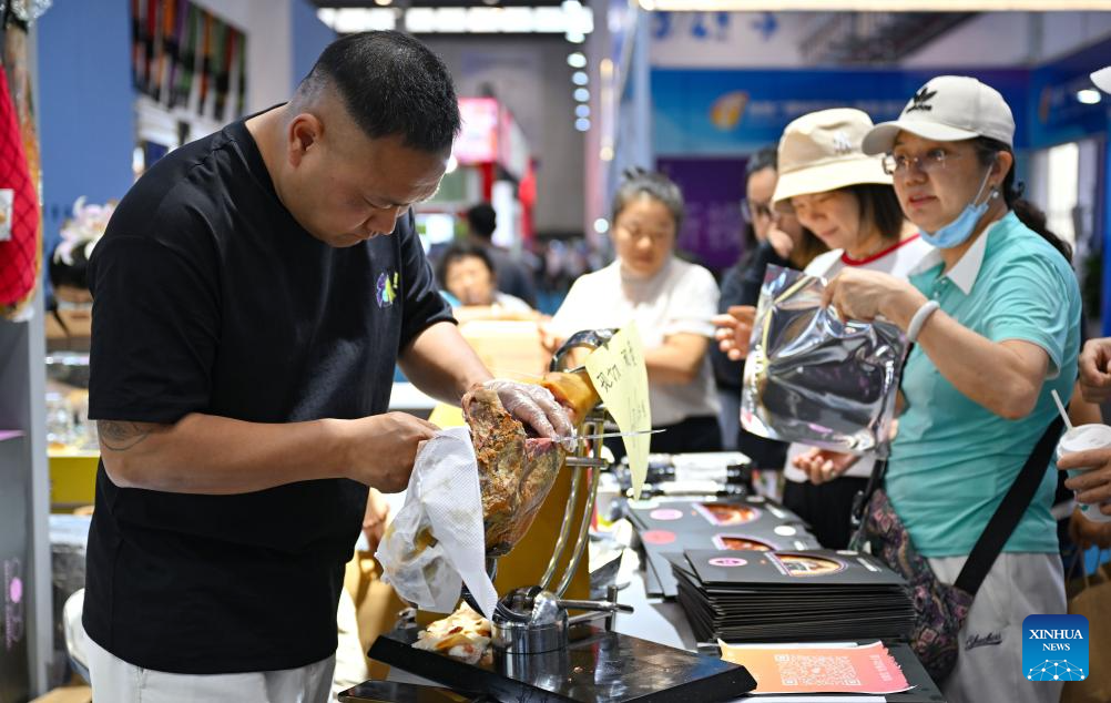 Visitors select the Spanish ham at the fourth China International Consumer Products Expo in Haikou, capital city of south China's Hainan Province, April 17, 2024. The expo opened to the public on Wednesday. (Xinhua/Guo Cheng)