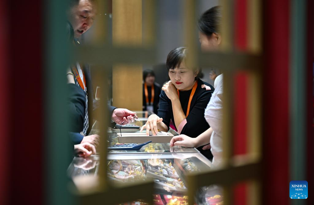 Visitors select gold ornaments at the fourth China International Consumer Products Expo in Haikou, capital city of south China's Hainan Province, April 17, 2024. The expo opened to the public on Wednesday. (Xinhua/Guo Cheng)