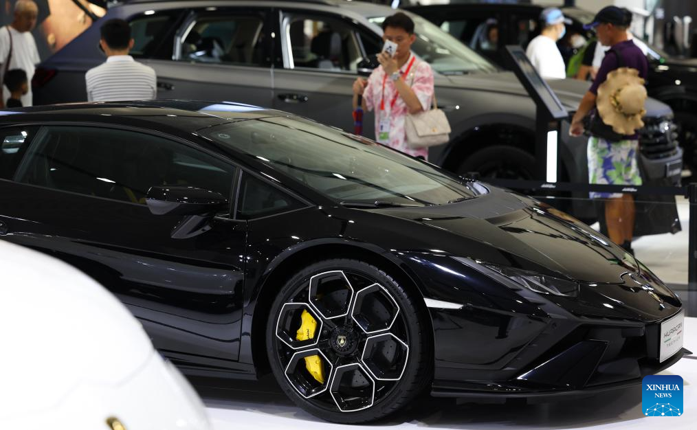 A visitor takes photos of a Lamborghini vehicle at the fourth China International Consumer Products Expo in Haikou, capital city of south China's Hainan Province, April 17, 2024. The expo opened to the public on Wednesday. (Xinhua/Yang Guanyu)