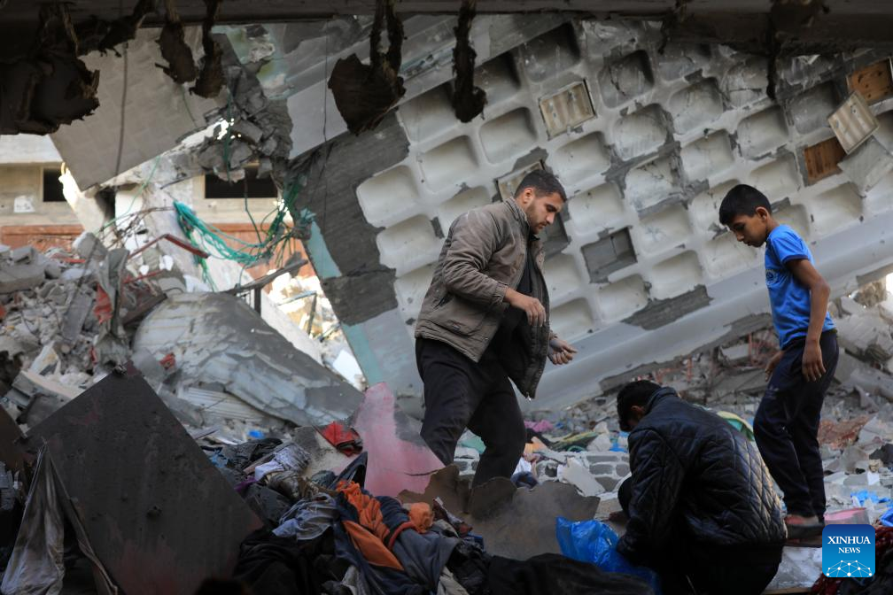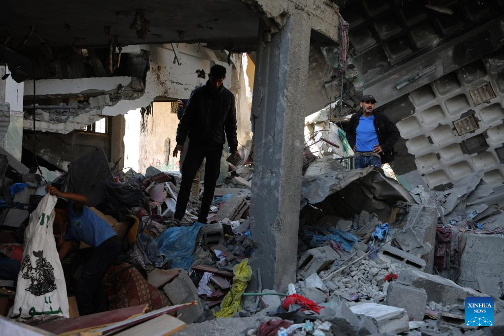 Palestinians inspect a destroyed house after an Israeli airstrike in the southern Gaza Strip city of Rafah, on April 17, 2024. The Palestinian death toll in the Gaza Strip from ongoing Israeli attacks has risen to 33,899, the Hamas-run Health Ministry said in a press statement on Wednesday. (Photo by Yasser Qudih/Xinhua)