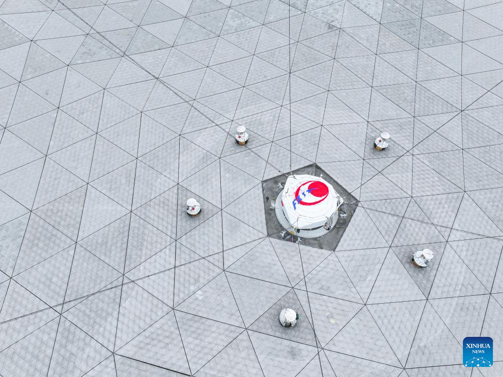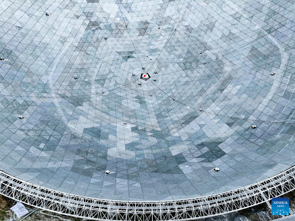 A drone photo taken on Feb. 26, 2024 shows China's Five-hundred-meter Aperture Spherical Radio Telescope (FAST) under maintenance in southwest China's Guizhou Province. China's Five-hundred-meter Aperture Spherical Radio Telescope (FAST), the world's largest single-dish radio telescope, has identified more than 900 new pulsars since its launch in 2016, its operator said Wednesday. (Xinhua/Ou Dongqu)