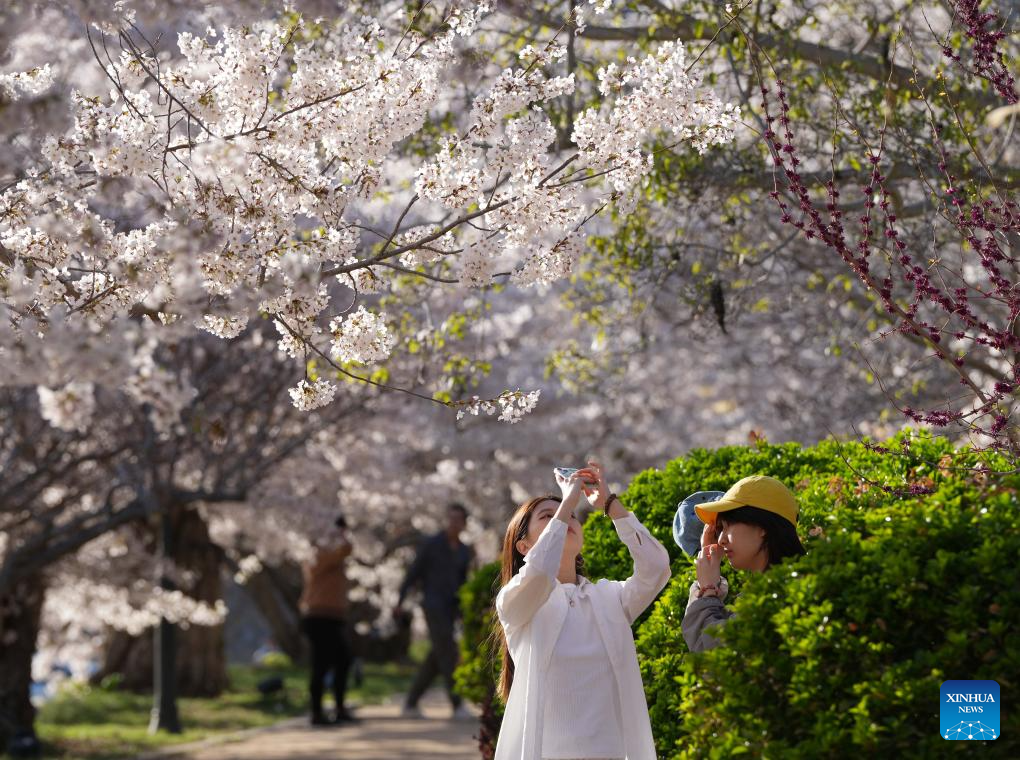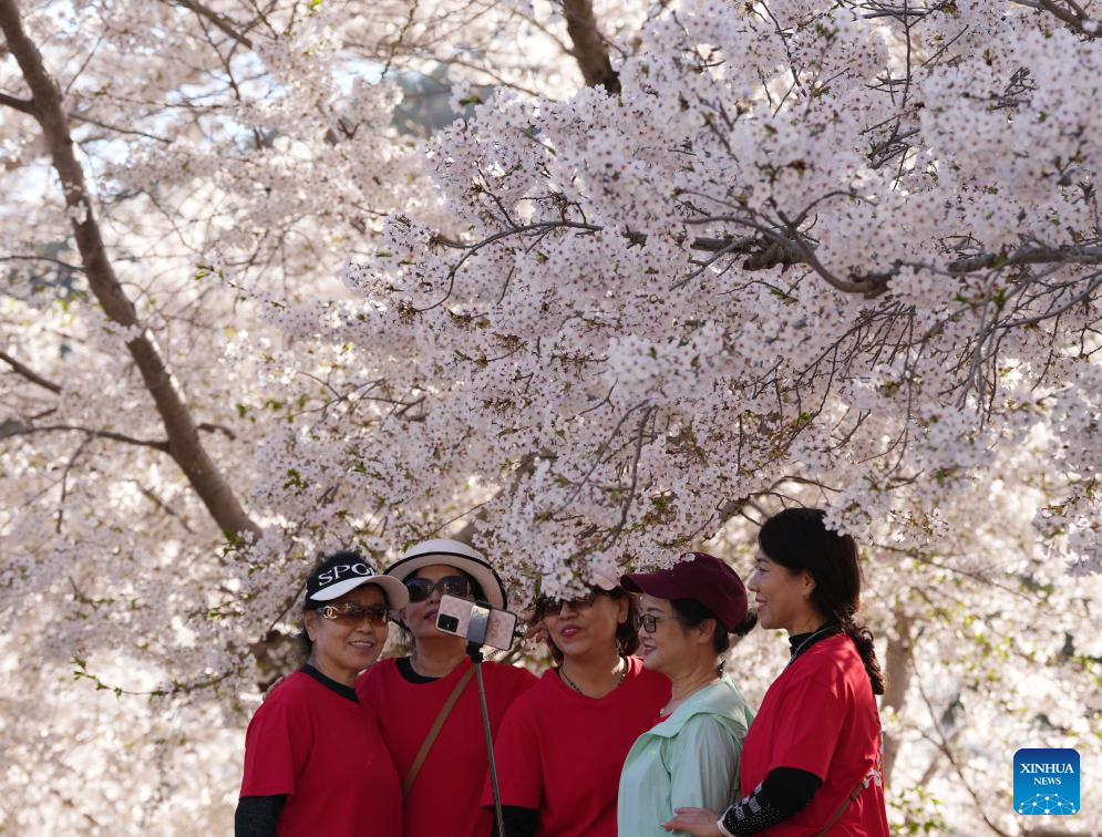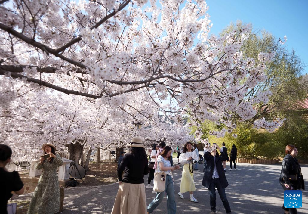 Tourists view cherry blossoms at Longwangtang cherry park in Dalian, northeast China's Liaoning Province, April 17, 2024. (Xinhua/Li Gang)