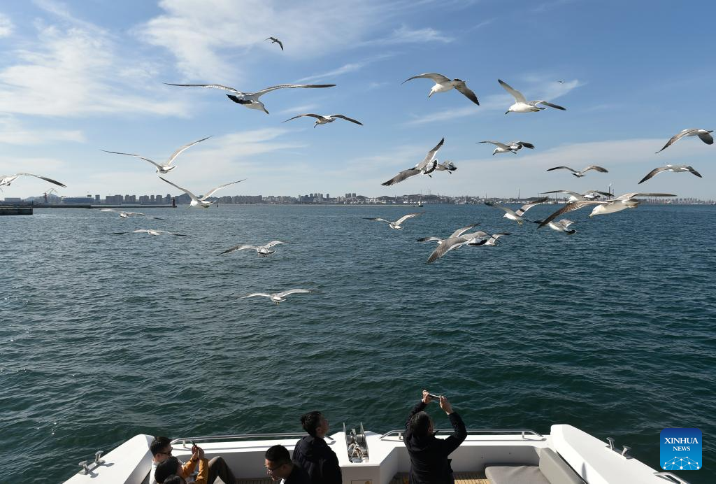 Tourists watch birds on a yacht in Dalian bay, northeast China's Liaoning Province, April 16, 2024. (Xinhua/Lu Peng)