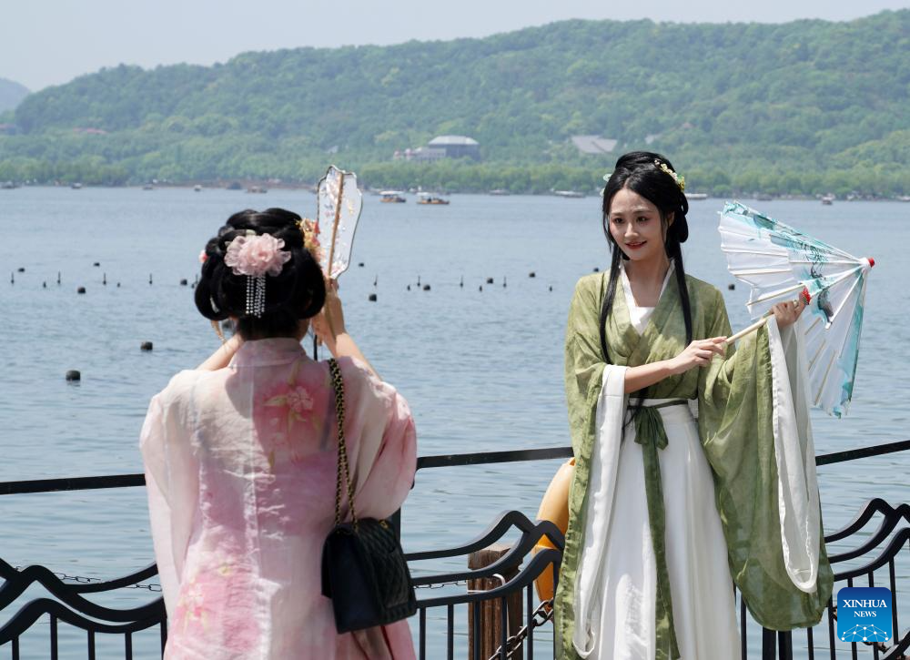 Tourists donning traditional Hanfu attire visit the West Lake in Hangzhou, east China's Zhejiang Province, April 18, 2024. (Xinhua/Han Chuanhao)
