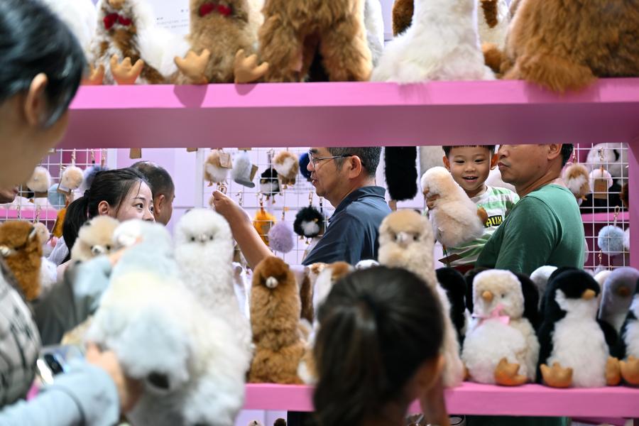 People select toys made from Australian alpaca fiber at the fourth China International Consumer Products Expo (CICPE) in Haikou, capital city of south China's Hainan Province, April 18, 2024. (Xinhua/Guo Cheng)