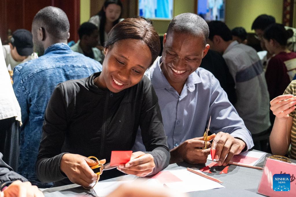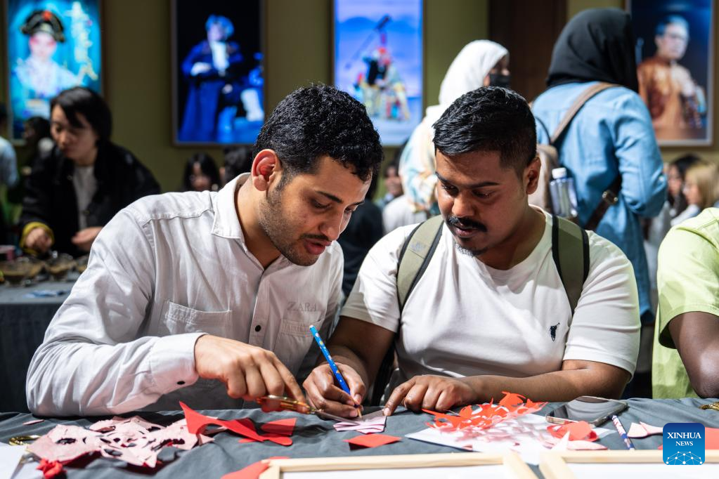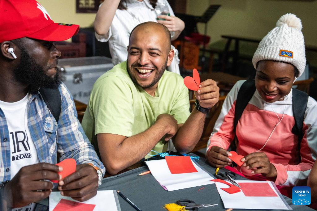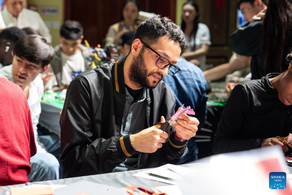 International students communicate with each other when they learn to make paper-cutting items at the Museum of Intangible Cultural Heritage of Changsha in central China's Hunan Province, April 18, 2024. As the United Nations Chinese Language Day is around the corner, which is observed on April 20 every year since 2010, the School of International Education of Central South University joined hands with the Museum of Intangible Cultural Heritage of Changsha to invite more than 100 international students from over 20 countries and regions to experience traditional Chinese intangible cultural heritages like paper cutting and dough modelling making. (Xinhua/Chen Sihan)