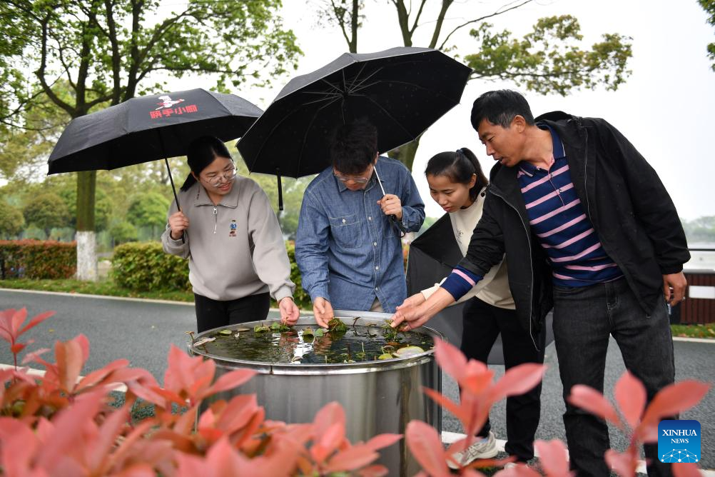 Li Yang (front) observes fish and aquatic plants at Datong Lake aquatic plants industrial demonstration park in Yiyang, central China's Hunan Province, April 11, 2024. (Xinhua/Chen Zhenhai)