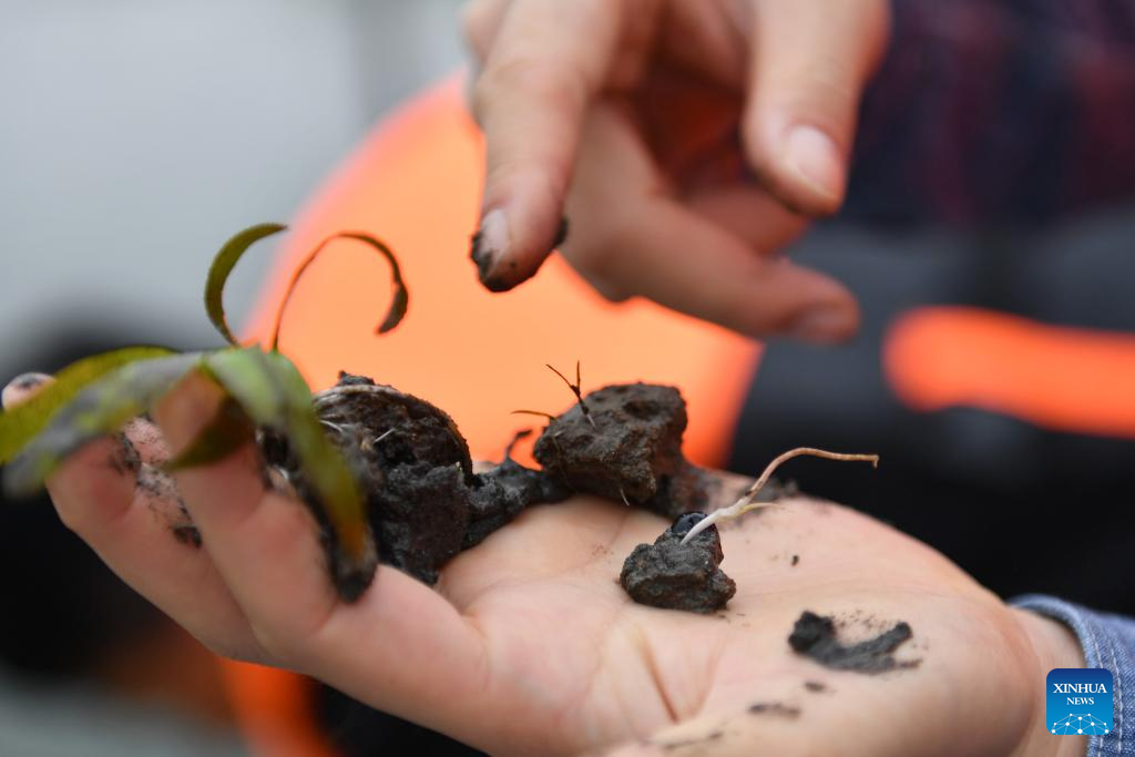 Li Yang shows the aquatic plants at the workstation at Datong Lake in Yiyang, central China's Hunan Province, April 11, 2024. (Xinhua/Chen Zhenhai)