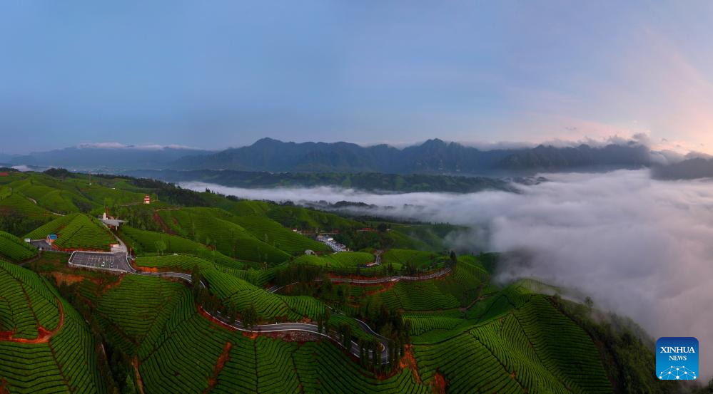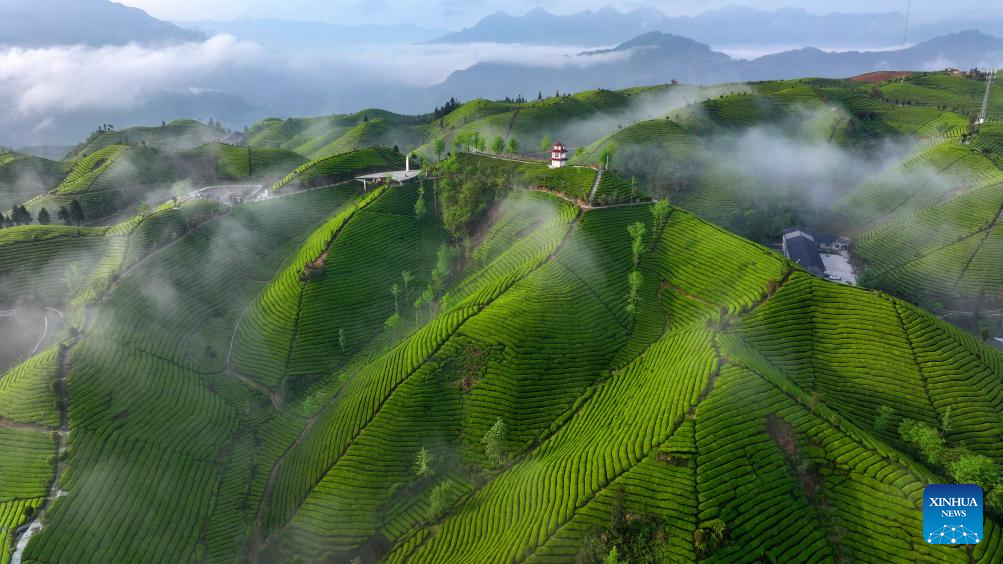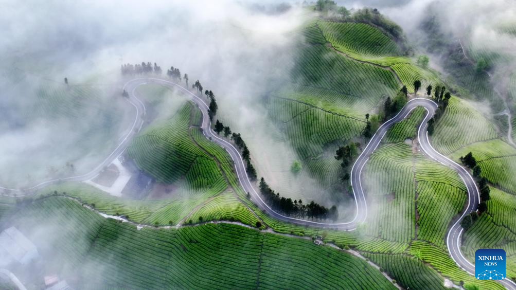 An aerial drone photo taken on April 18, 2024 shows the view of tea gardens in Zouma Town of Hefeng County, central China's Hubei Province. The county of Hefeng has made efforts in the coordinated development of tea planting and tourism industries to boost rural revitalization. (Photo by Yang Shunpi/Xinhua)