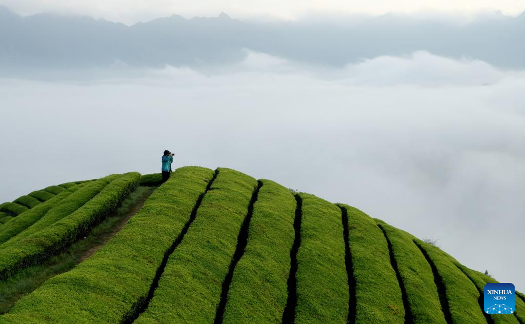 A tourist visits a tea garden in Zouma Town of Hefeng County, central China's Hubei Province, April 18, 2024. The county of Hefeng has made efforts in the coordinated development of tea planting and tourism industries to boost rural revitalization. (Photo by Yang Shunpi/Xinhua)