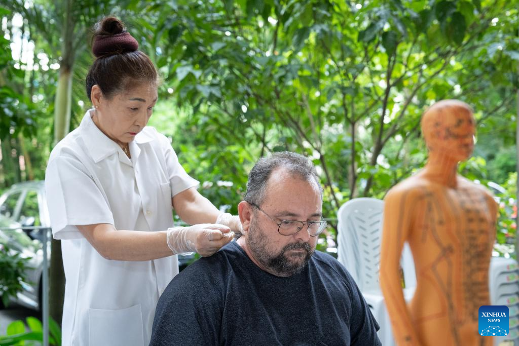 A man experiences traditional Chinese medicine treatment during an event marking the United Nations Chinese Language Day in Rio de Janeiro, Brazil, on April 18, 2024. The Pontifical Catholic University of Rio de Janeiro in Brazil hosted the event on Thursday, attracting a large number of spectators to experience the Chinese culture. (Xinhua/Wang Tiancong)