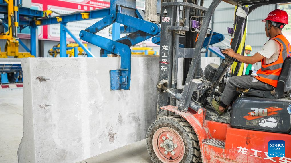 A worker transports guardrail component along the Guiyang-Pingtang expressway in southwest China's Guizhou Province, April 18, 2024. With a designed speed of 100 km per hour, the Guiyang-Pingtang expressway in Guizhou has a total length of 174.018 km. (Xinhua/Tao Liang)