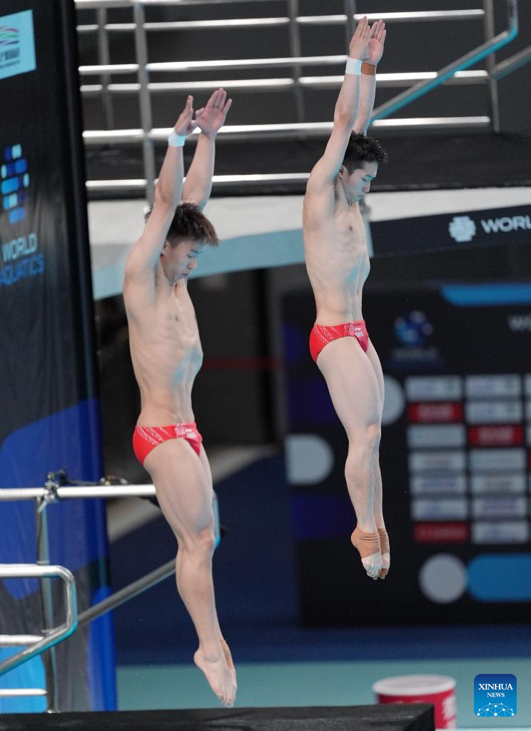 Long Daoyi (R)/Wang Zongyuan of China compete during the men's 3m synchronised final at the World Acquatics Diving World Cup 2024 Super Final Stop 1 in Xi'an, northwest China's Shaanxi Province, April 19, 2024. (Xinhua/Zhang Bowen)