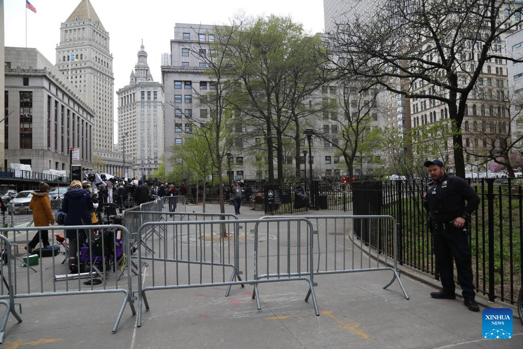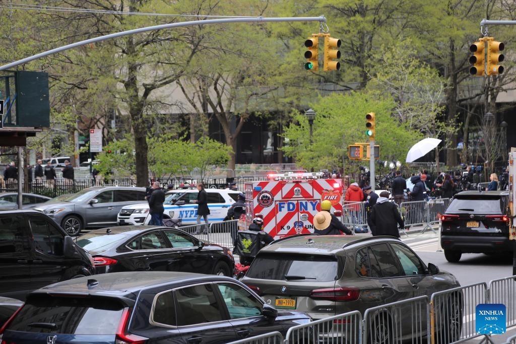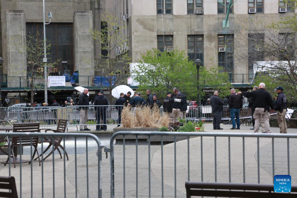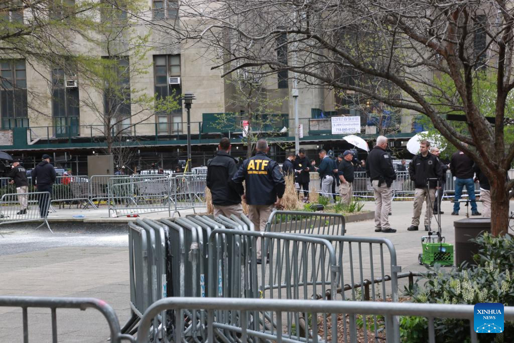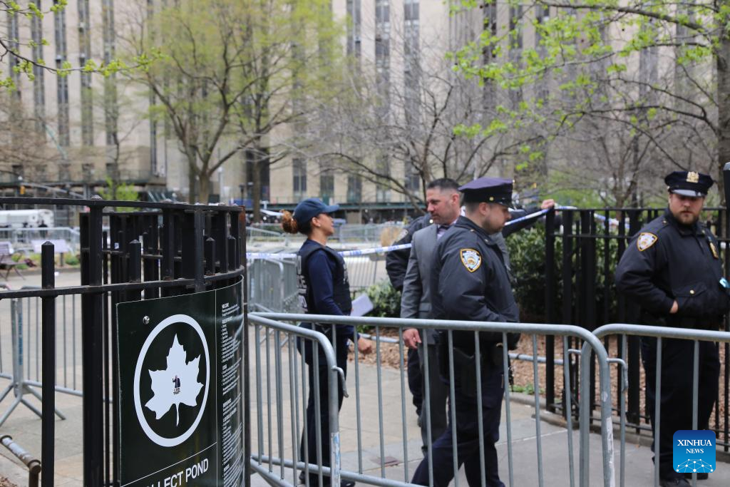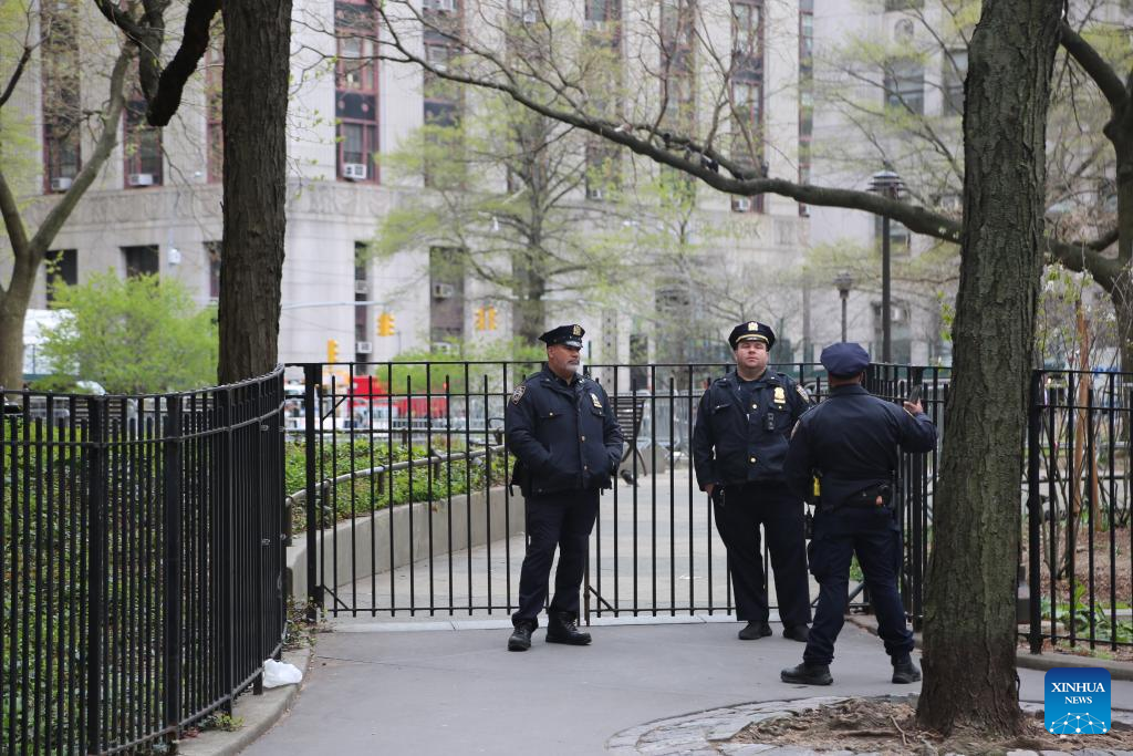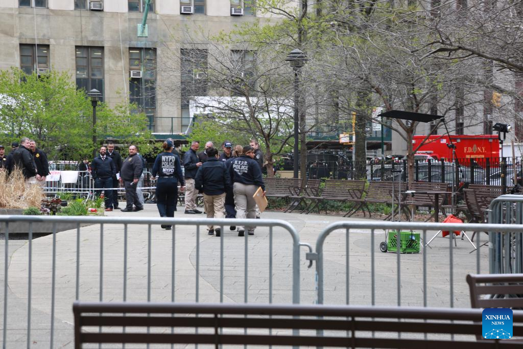Law enforcement officials are on duty as investigation goes on outside Manhattan Criminal Court in New York, the United States, on April 19, 2024. A man set himself on fire Friday afternoon outside Manhattan Criminal Court as jury selection was under way in the criminal trial of former U.S. President Donald Trump, according to media reports and videos posted on social media. (Xinhua/Liu Yanan)