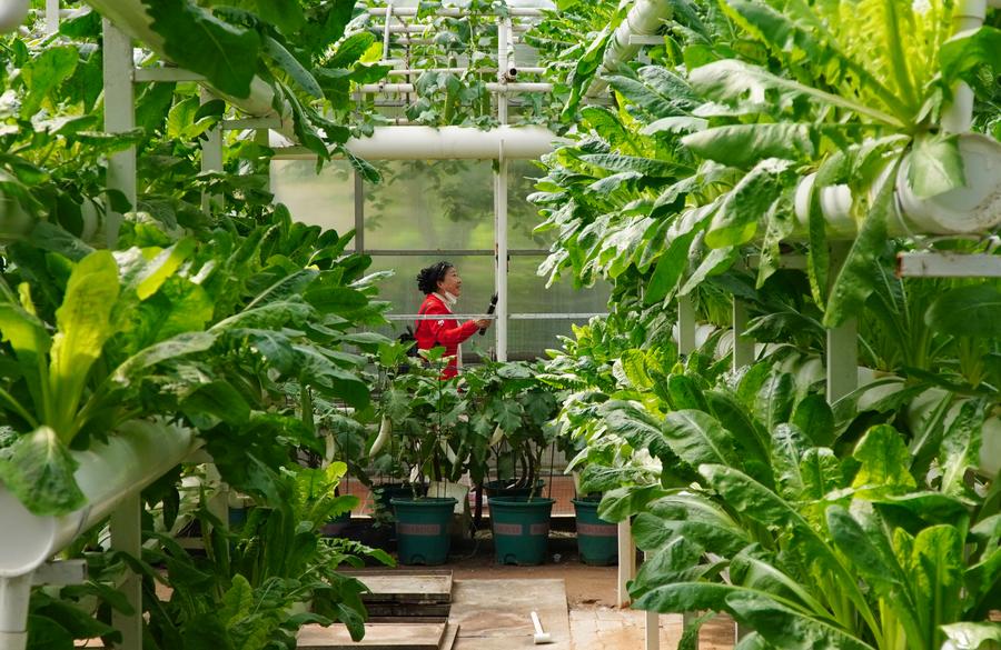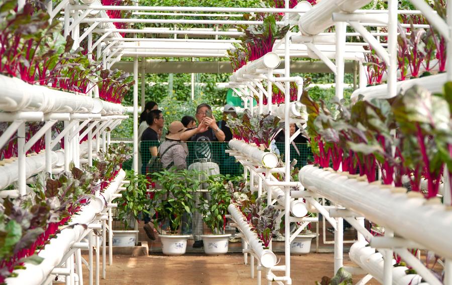 A woman visits a soilless cultivation greenhouse at the 25th China (Shouguang) International Vegetable Science and Technology Expo in Shouguang, east China's Shandong Province, April 21, 2024. (Xinhua/Xu Suhui)