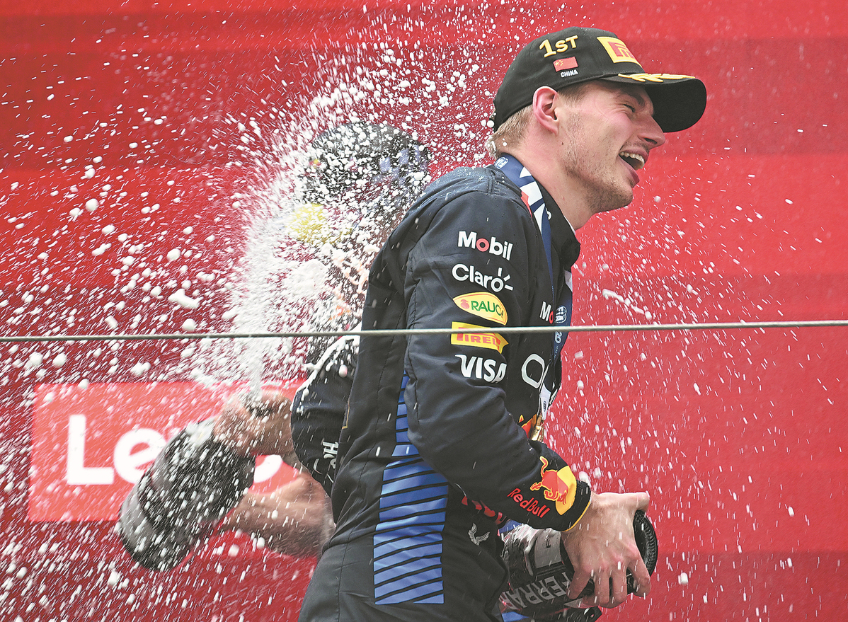 Red Bull Racing driver Max Verstappen of the Netherlands celebrates on the podium on Sunday after winning the Chinese Grand Prix. WEI XIAOHAO/CHINA DAILY
