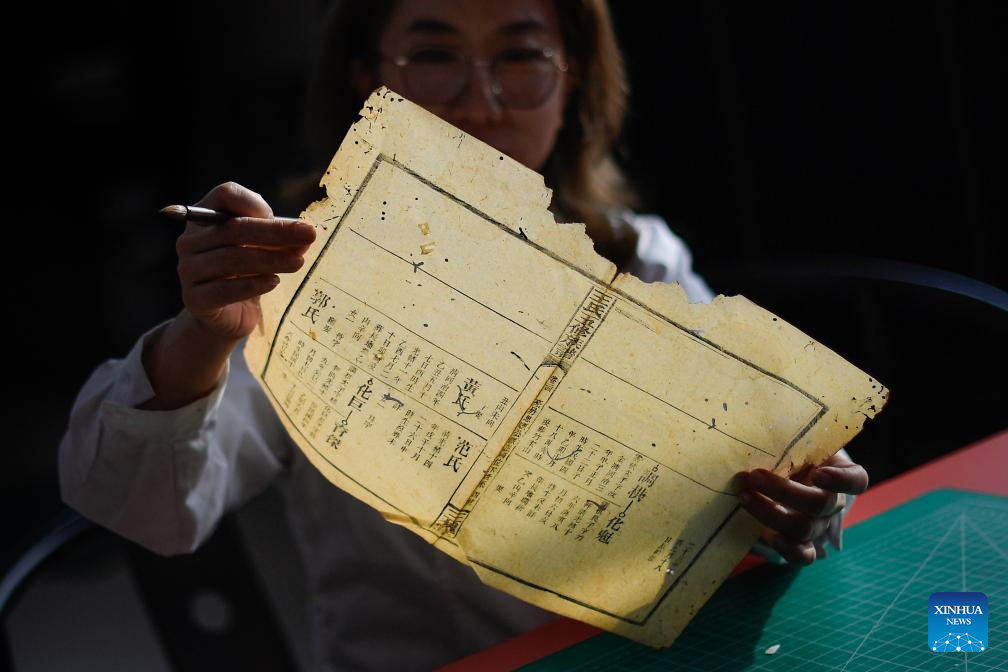 Zhang Hua, a restorer of ancient books in the library of Jilin University, prepares for the restoration of an ancient book at the library of Jilin University in Changchun, northeast China's Jilin Province, April 19, 2024. (Xinhua/Xu Chang)