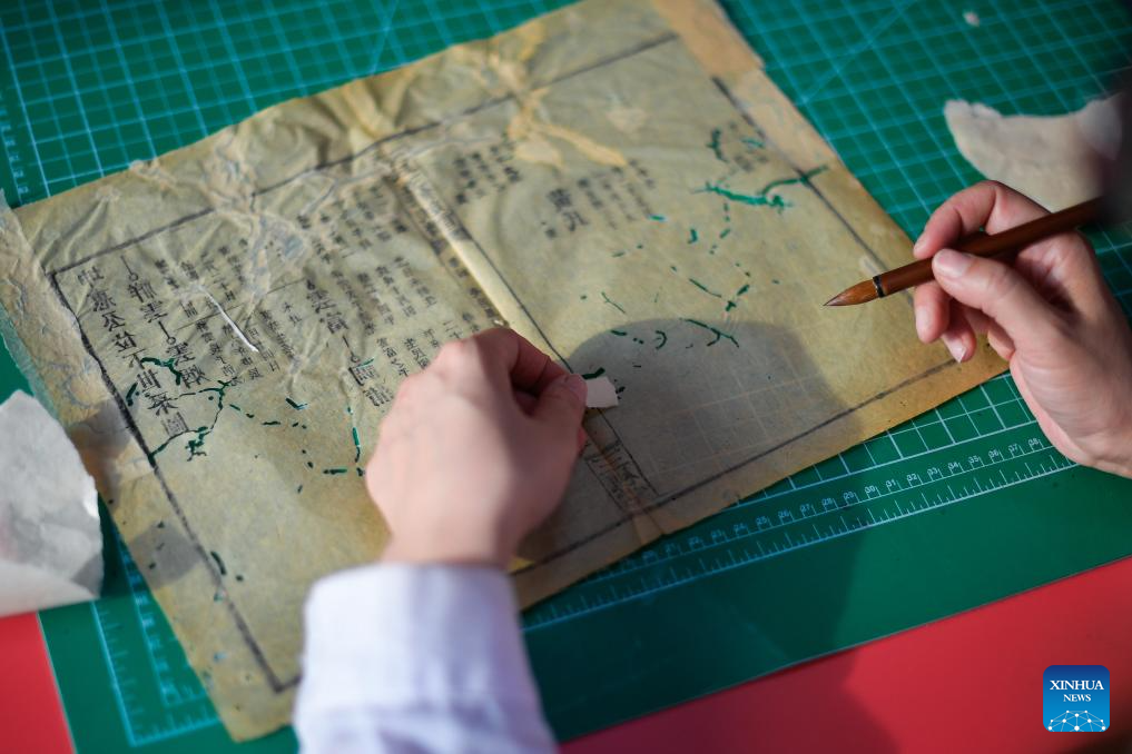 Zhang Hua, a restorer of ancient books in the library of Jilin University, works on the restoration of an ancient book at the library of Jilin University in Changchun, northeast China's Jilin Province, April 19, 2024. (Xinhua/Xu Chang)