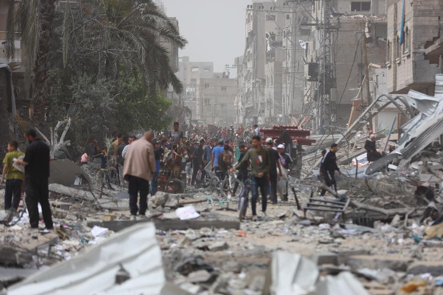 People gather among the rubble in Nuseirat refugee camp, central Gaza Strip, on April 18, 2024. (Xinhua)