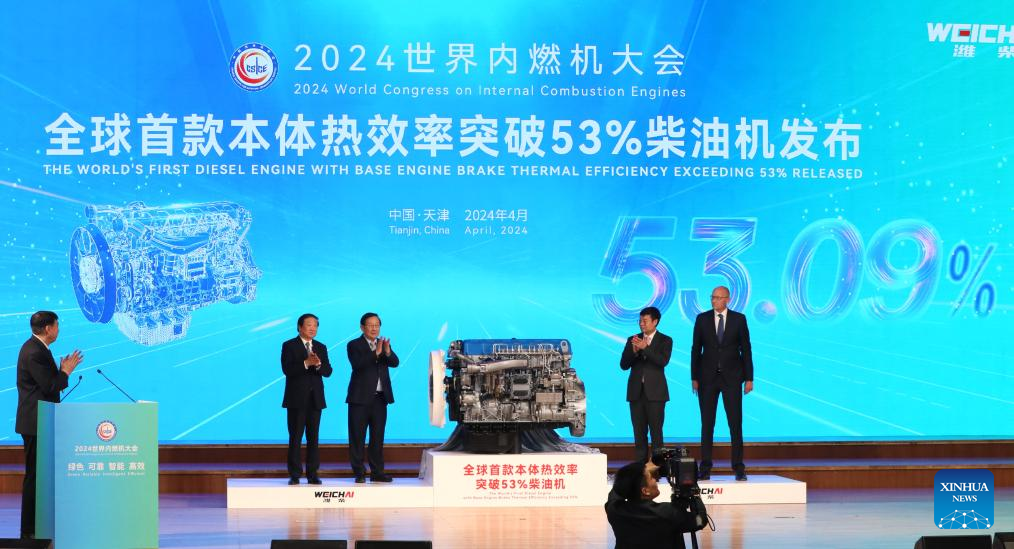 The world's first commercial diesel engine with a thermal efficiency of over 53 percent for the base engine, developed by Weichai Power Co., Ltd., a leading Chinese powertrain producer, is released at the opening ceremony of the 2024 World Congress on Internal Combustion Engines in north China's Tianjin Municipality, April 20, 2024. (Tianjin University/Handout via Xinhua)