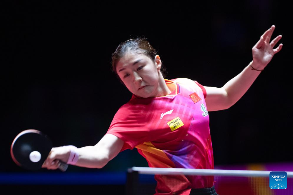 Sun Yingsha competes during the women's singles semifinal match between Sun Yingsha of China and her teammate Chen Meng at the ITTF World Cup Macao 2024 at Galaxy Arena in Macao, south China, April 20, 2024. (Xinhua/Cheong Kam Ka)