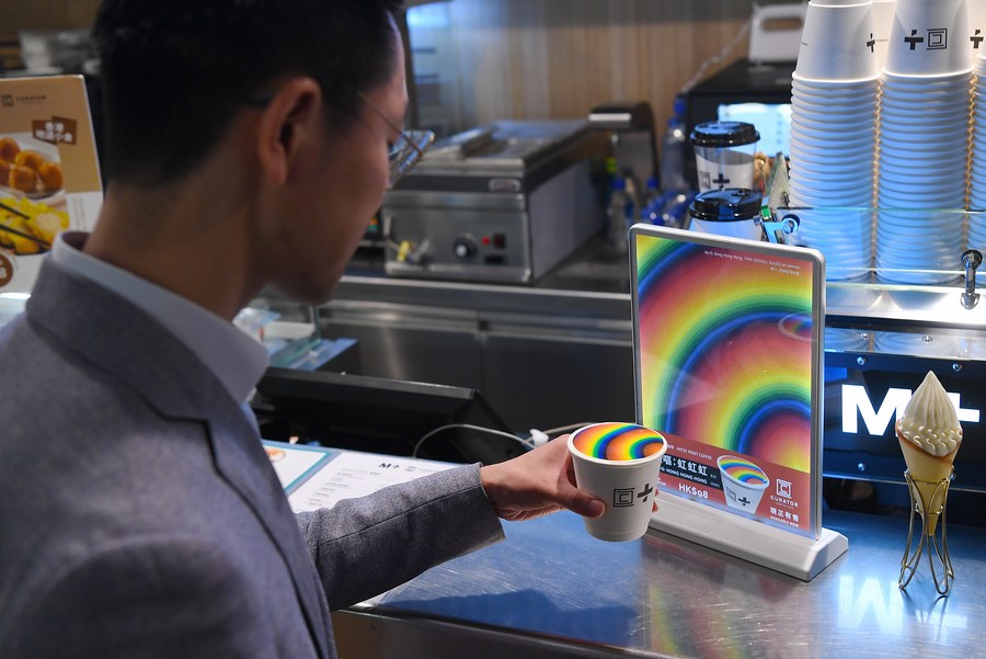 HONG KONG, April 22 (Xinhua) -- Snap a picture of a Japanese avant-garde artist's rainbow-striped drape cascading from the ceiling of M+ Museum of visual culture in Hong Kong's West Kowloon Cultural District, and it will end up on the surface of your latte from the coffee shop at the museum.