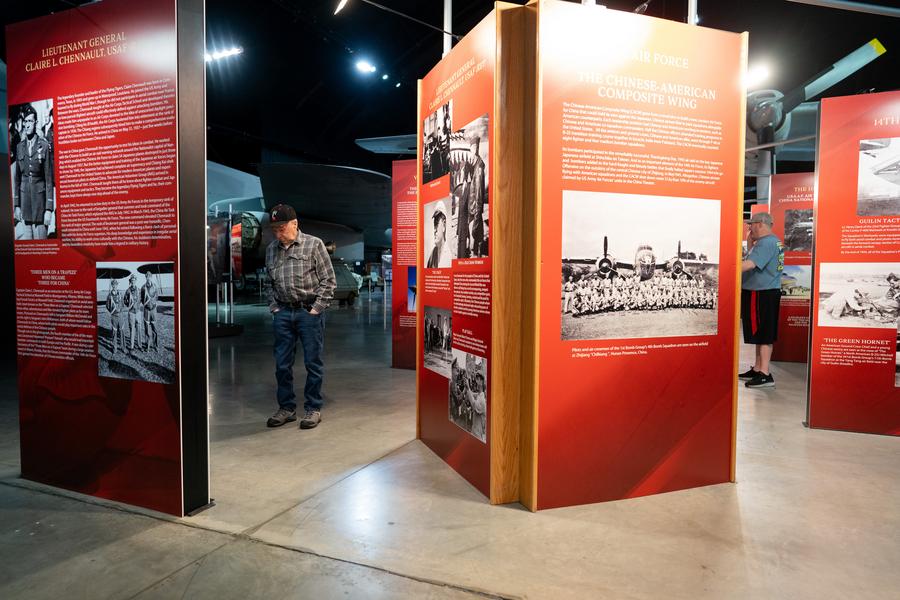 People visit a photo exhibition commemorating the Flying Tigers and Doolittle Raiders, Americans who fought Japan in World War II in cooperation with the Chinese people, at the National Museum of the U.S. Air Force in Dayton, Ohio, the United States, April 18, 2024. (Xinhua/Liu Jie)