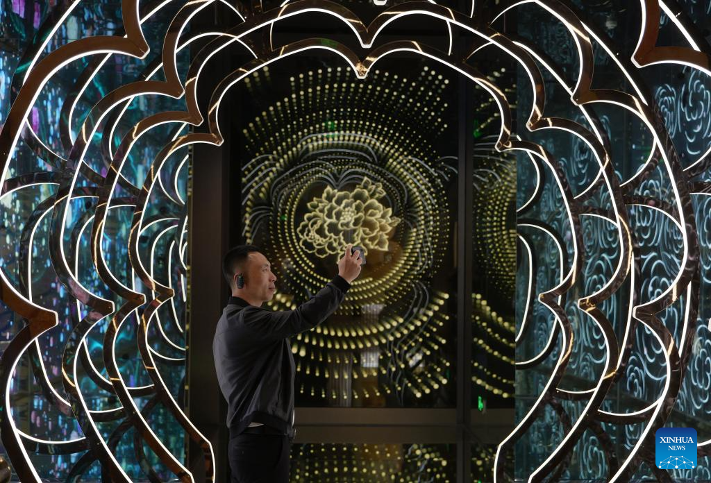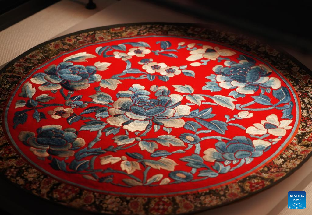 This photo taken on April 16, 2024 shows an embroidery work containing peony elements at Peony Pavilion in Luoyang, central China's Henan Province. As an imperial capital during 13 dynasties, Luoyang claims to have the country's best peonies. In recent years, Luoyang has actively explored the culture related to peony flowers, encouraging the development of peony-themed porcelain, painting, and many other characteristic activities containing peony elements. This enables tourists to enjoy both the flowers and the vibe of this ancient capital. (Xinhua/Li An)