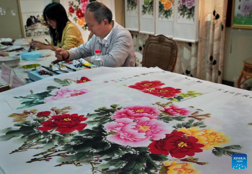 Painters create traditional paintings on peony at National Peony Garden in Luoyang, central China's Henan Province, April 16, 2024. As an imperial capital during 13 dynasties, Luoyang claims to have the country's best peonies. In recent years, Luoyang has actively explored the culture related to peony flowers, encouraging the development of peony-themed porcelain, painting, and many other characteristic activities containing peony elements. This enables tourists to enjoy both the flowers and the vibe of this ancient capital. (Xinhua/Li An)