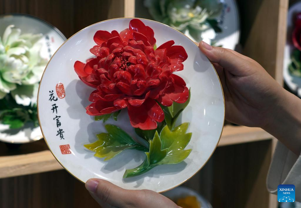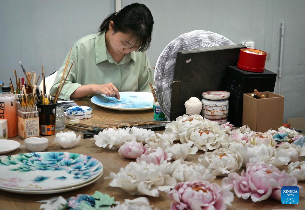 A staff member makes a peony-themed porcelain handicraft at Luoyang Peony Porcelain Museum in Luoyang, central China's Henan Province, April 17, 2024. As an imperial capital during 13 dynasties, Luoyang claims to have the country's best peonies. In recent years, Luoyang has actively explored the culture related to peony flowers, encouraging the development of peony-themed porcelain, painting, and many other characteristic activities containing peony elements. This enables tourists to enjoy both the flowers and the vibe of this ancient capital. (Xinhua/Li An)