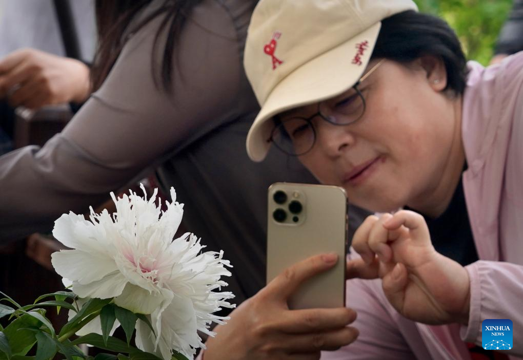A tourist takes photos of a peony at a botanical garden in Luoyang, central China's Henan Province, April 17, 2024. As an imperial capital during 13 dynasties, Luoyang claims to have the country's best peonies. In recent years, Luoyang has actively explored the culture related to peony flowers, encouraging the development of peony-themed porcelain, painting, and many other characteristic activities containing peony elements. This enables tourists to enjoy both the flowers and the vibe of this ancient capital. (Xinhua/Li An)