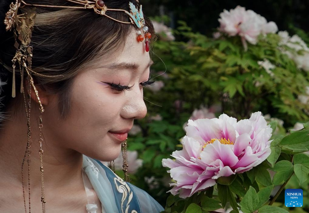 A tourist in traditional Chinese attire enjoys peony flowers at the China National Flower Garden in Luoyang, central China's Henan Province, April 16, 2024. As an imperial capital during 13 dynasties, Luoyang claims to have the country's best peonies. In recent years, Luoyang has actively explored the culture related to peony flowers, encouraging the development of peony-themed porcelain, painting, and many other characteristic activities containing peony elements. This enables tourists to enjoy both the flowers and the vibe of this ancient capital. (Xinhua/Li Jianan)