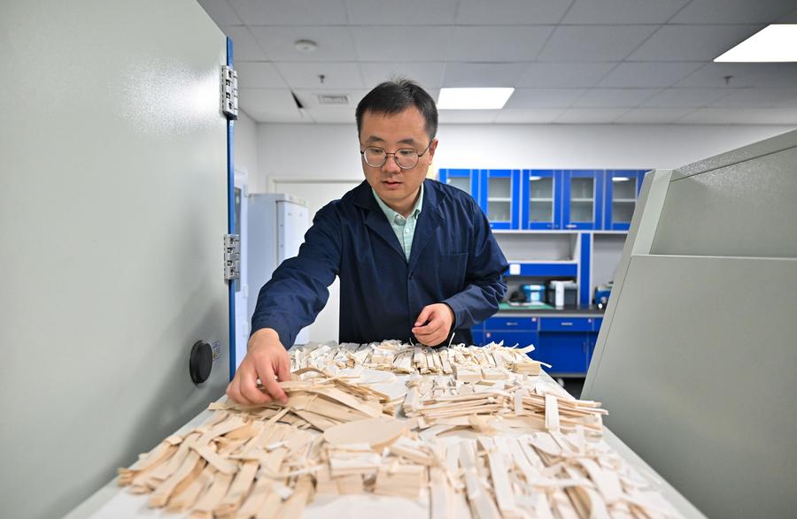 Gao Xuemiao measures the value of paper fibers at the laboratory of Tianjin Library in north China's Tianjin Municipality, April 18, 2024. (Xinhua/Sun Fanyue)