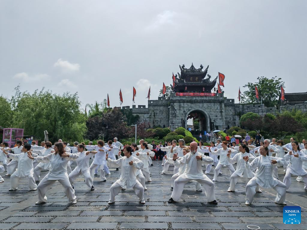 Chinese and French martial arts enthusiasts practice the traditional exercise Baduanjin in the Qingyan ancient town in Guiyang City, southwest China's Guizhou Province, April 19, 2024. (Xinhua/Wu Si)