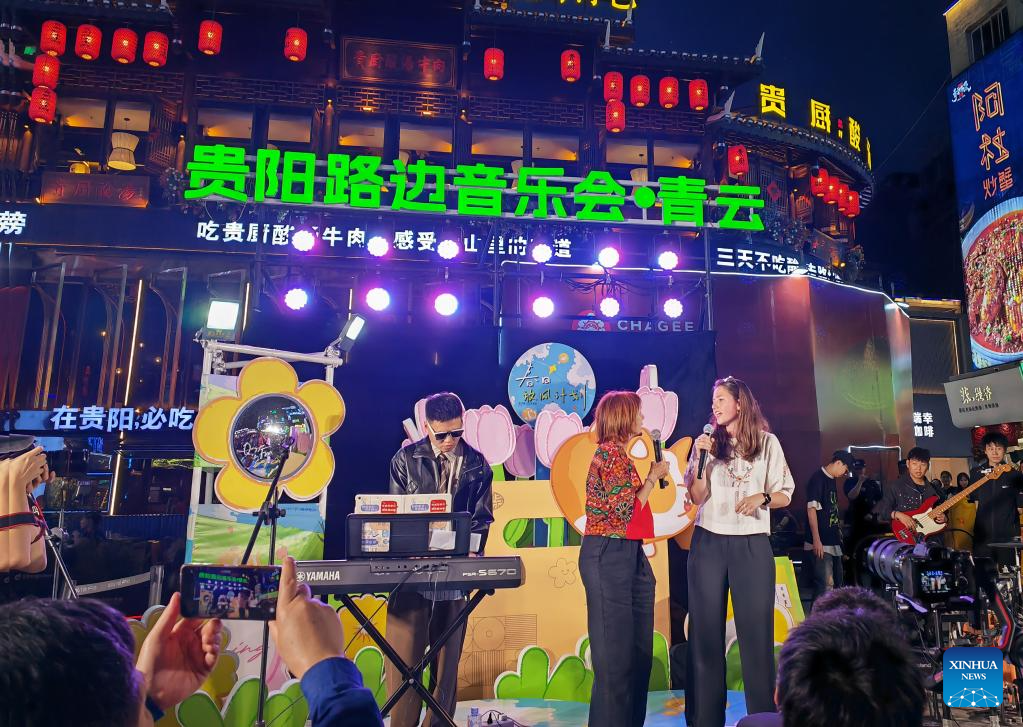French tourist Hana Accot (1st R) sings a song at a roadside concert in Guiyang City, southwest China's Guizhou Province, April 18, 2024. (Xinhua/Wu Si)