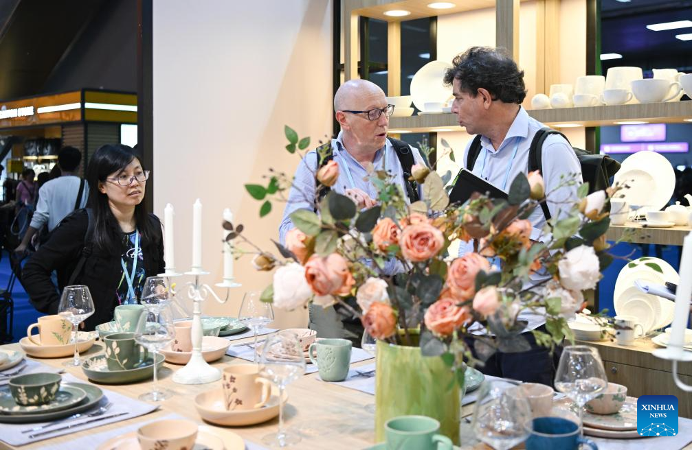 Purchasers visit a booth of tableware at the second phase of the 135th Canton Fair in Guangzhou, south China's Guangdong Province, April 23, 2024. The second phase of the 135th Canton Fair opened in Guangzhou on Tuesday focusing on displaying products such as household goods, gifts, decorations, building materials and furniture with an exhibition area of about 515,000 square meters. (Xinhua/Deng Hua)
