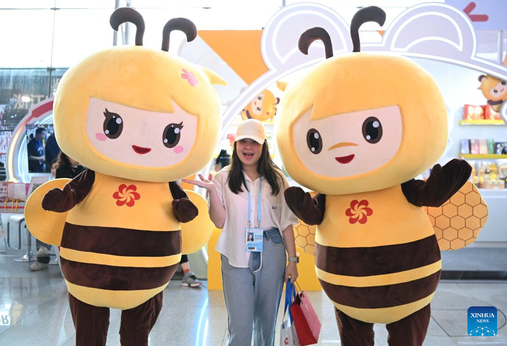 A purchaser poses for photos with mascots at the second phase of the 135th Canton Fair in Guangzhou, south China's Guangdong Province, April 23, 2024. The second phase of the 135th Canton Fair opened in Guangzhou on Tuesday focusing on displaying products such as household goods, gifts, decorations, building materials and furniture with an exhibition area of about 515,000 square meters. (Xinhua/Deng Hua)
