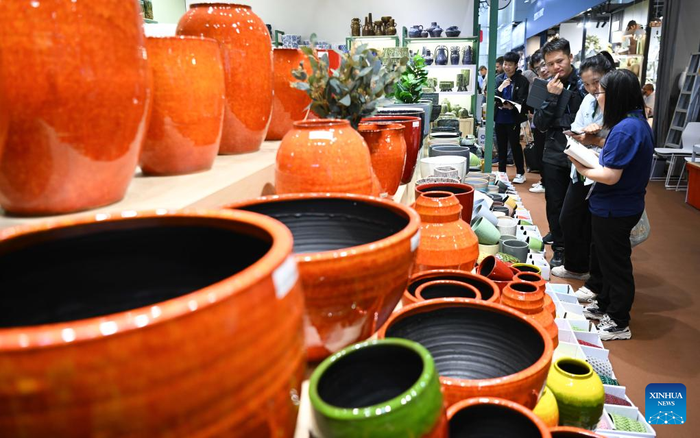 This photo taken on April 23, 2024 shows a booth of pottery and porcelain at the second phase of the 135th Canton Fair in Guangzhou, south China's Guangdong Province. The second phase of the 135th Canton Fair opened in Guangzhou on Tuesday focusing on displaying products such as household goods, gifts, decorations, building materials and furniture with an exhibition area of about 515,000 square meters. (Xinhua/Deng Hua)