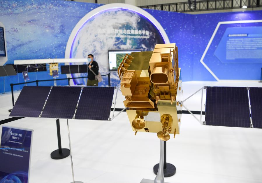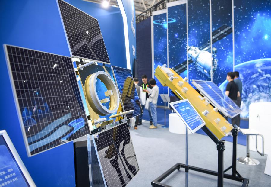 This photo shows a satellite model at an exhibition on aerospace in Wuhan, central China's Hubei Province, April 23, 2024. (Xinhua/Du Zixuan)