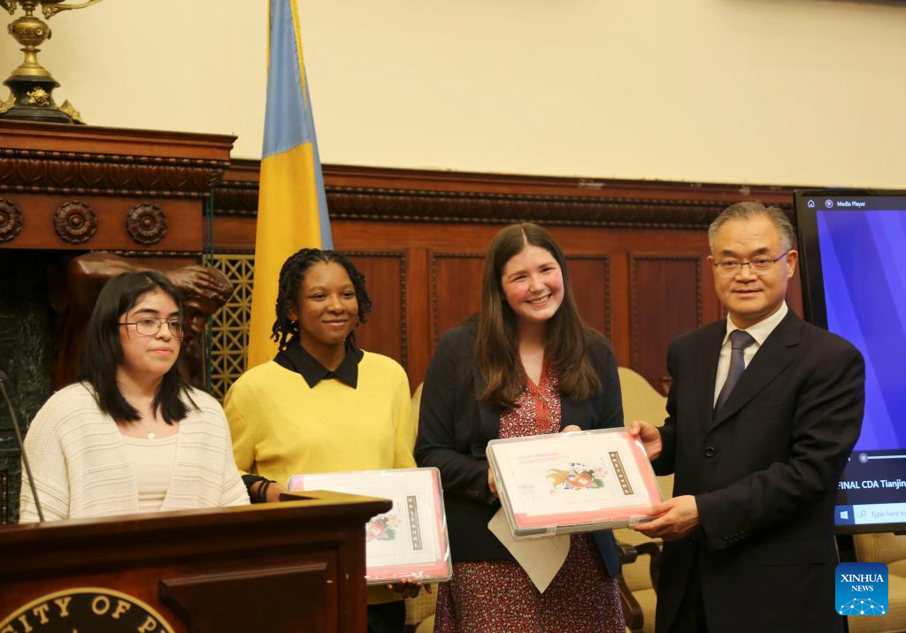 Liu Guiping (1st R), executive vice mayor of Tianjin, presents gifts to students of Philadelphia in Philadelphia, the United States, April 23, 2024. Tianjin in north China and Philadelphia on the U.S. East Coast celebrated their 45-year sister city ties Tuesday, vowing to deepen cooperation and exchange in various fields. (Xinhua/Liu Yanan)